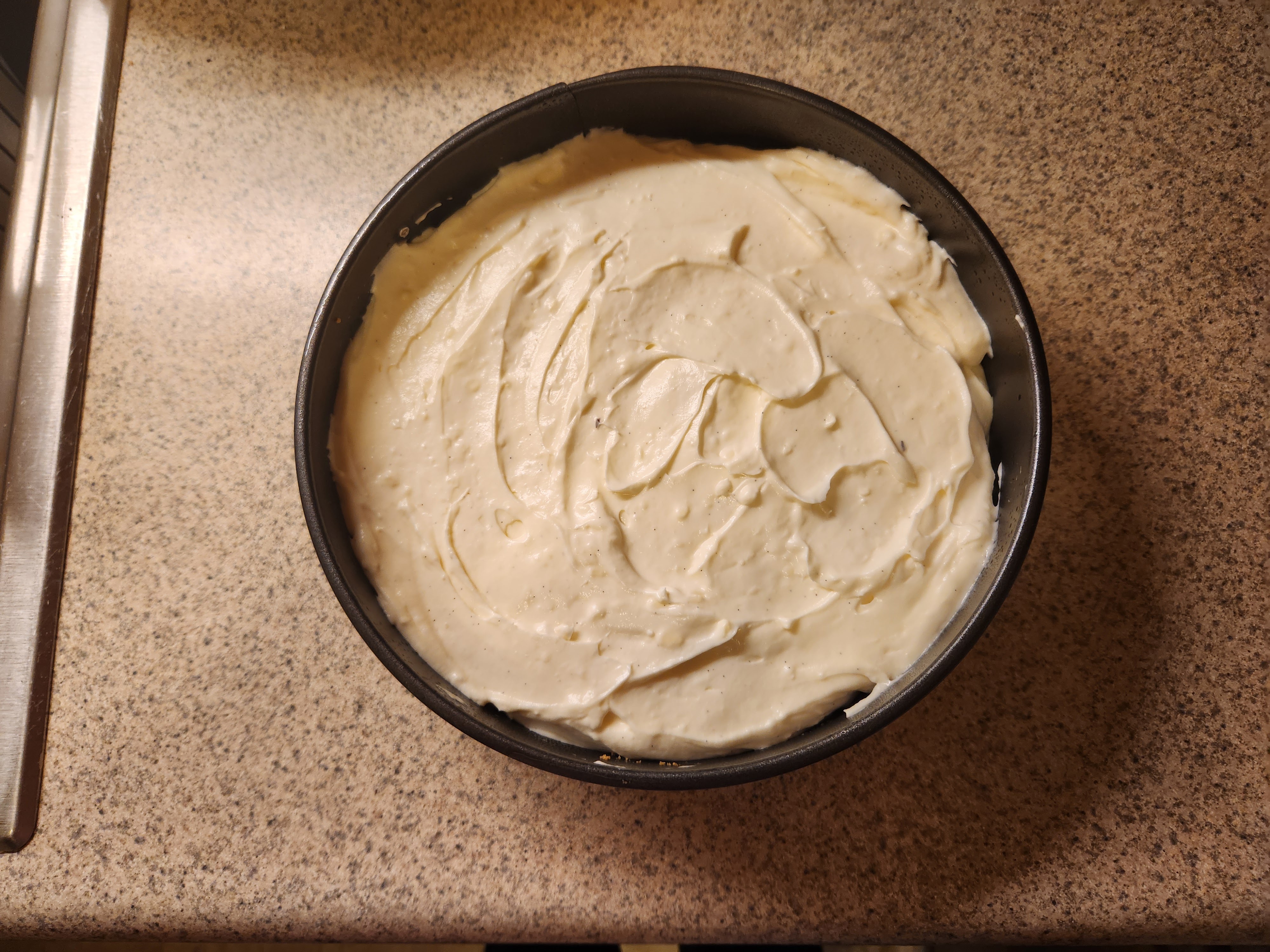 Hello everyone. Friday I made Cheesecake. It came out great. This was the first time I tried this recipe. It was a no bake cheesecake. It had vanilla extract and vanilla bean in it. It was creamy without being too rich or too heavy. I also served strawberry sauce with it. Here is a photo: