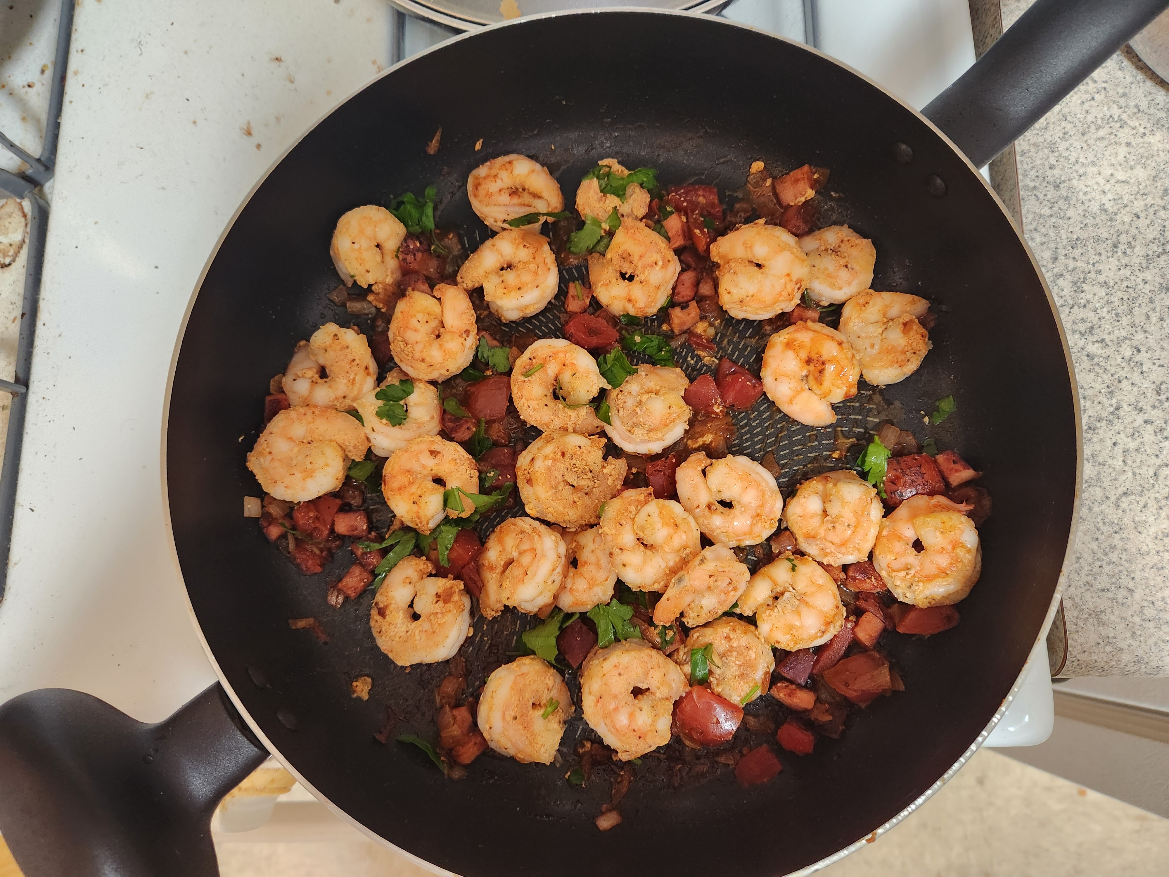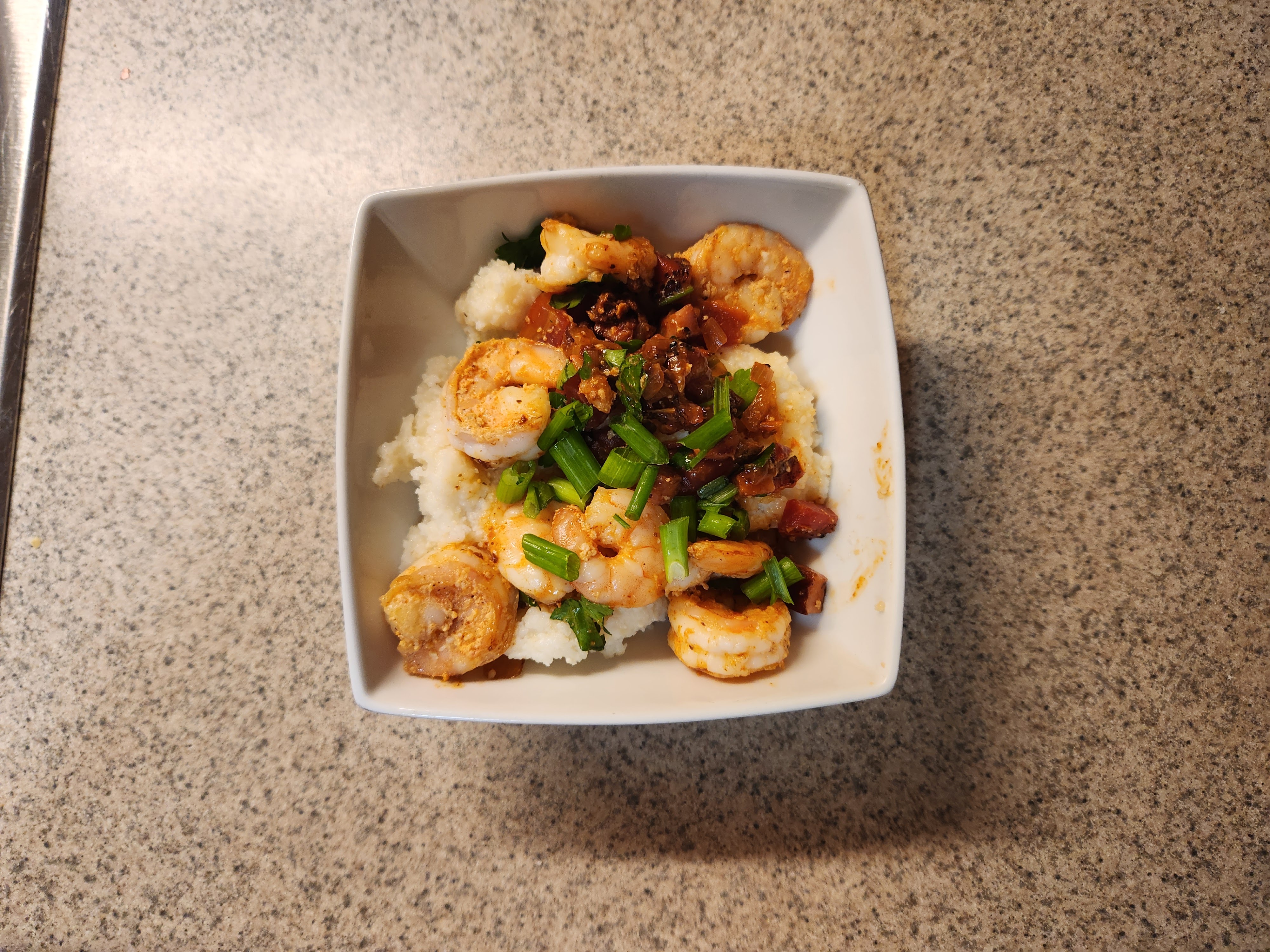 Hello everyone. Friday I made Shrimp and Grits. It came out great. This was my first attempt at making Shrimp and Grits. The shrimp was cooked in a sauce that had ham, shallots, parsley, and Old Bay Seasoning, and the grits had Havarti and Pecorino and Romano cheese. It tasted delicious without being too heavy or overpowering. And it also wasn’t too spicy. Here are some photos:
